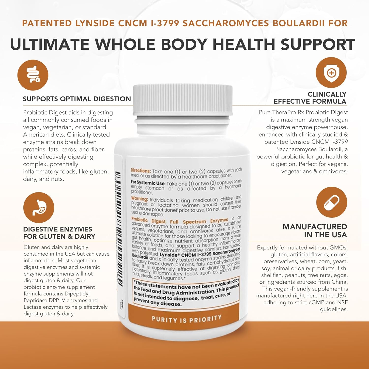 - OPTIMAL DIGESTION WITH PROBIOTIC ENZYME ENHANCEMENT: Achieving a healthy gut requires the perfect combination of probiotics and plant-based enzymes. Pure TheraPro Rx has crafted a maximum strength vegan digestive enzyme solution, enriched with the patented Lynside CNCM I-3799 Saccharomyces Boulardii probiotic. This powerful blend supports gut health and overall digestion, making it an ideal addition to our extra strength digestive enzyme formula.