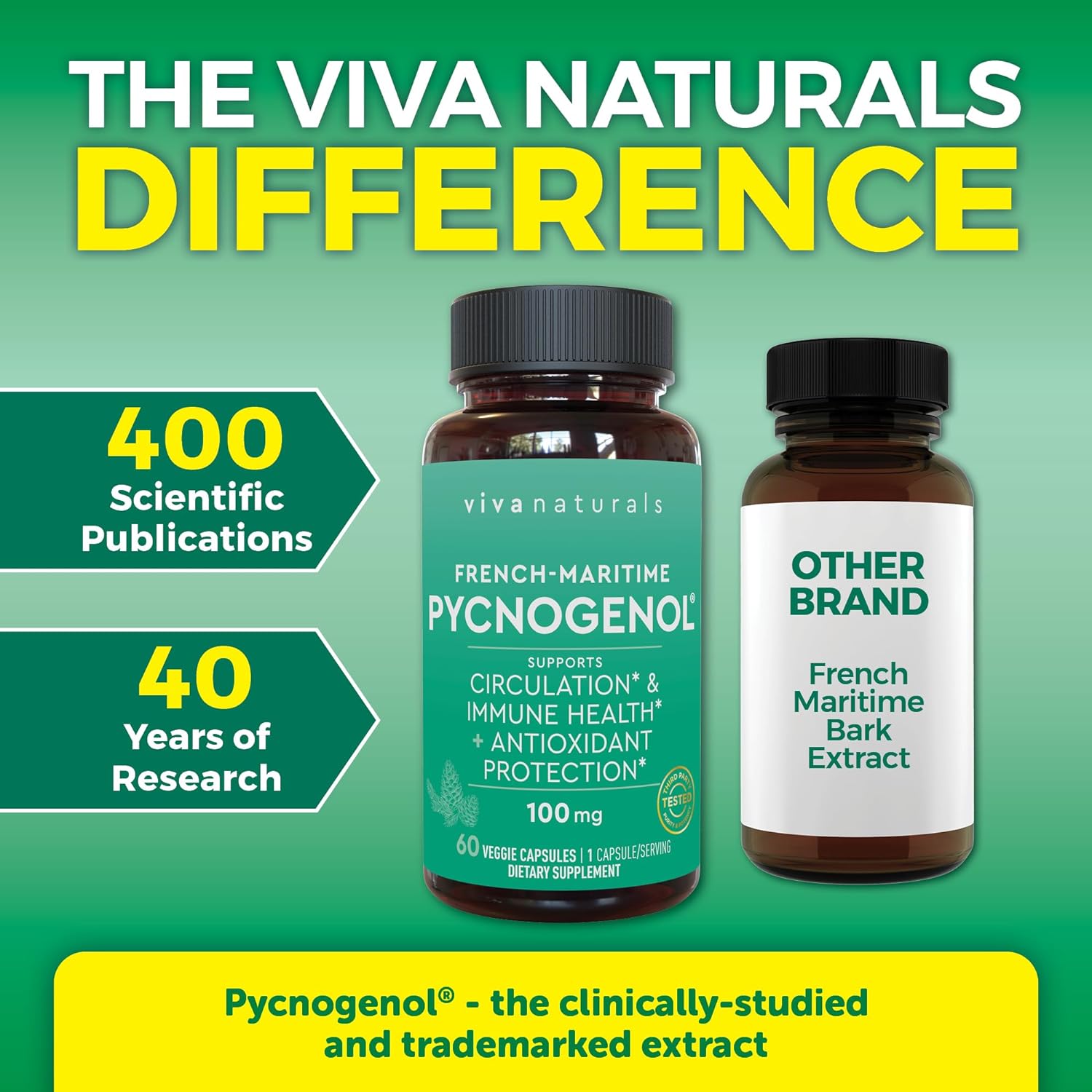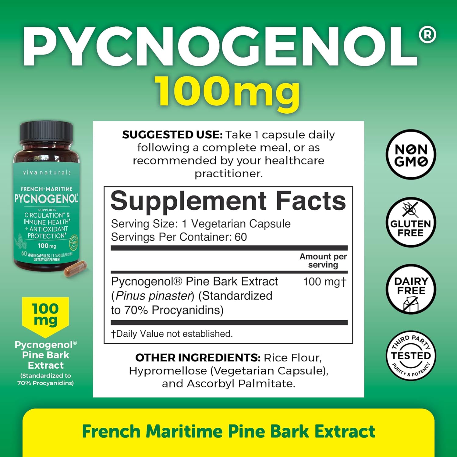 - ✔️ VEGETARIAN FRIENDLY, NON-GMO, GLUTEN FREE: Viva Naturals Pycnogenol is an ideal choice for vegetarians, and it's made without GMOs, gluten, and dairy. Made from a premium ingredient, this supplement undergoes third-party testing to ensure purity and potency.