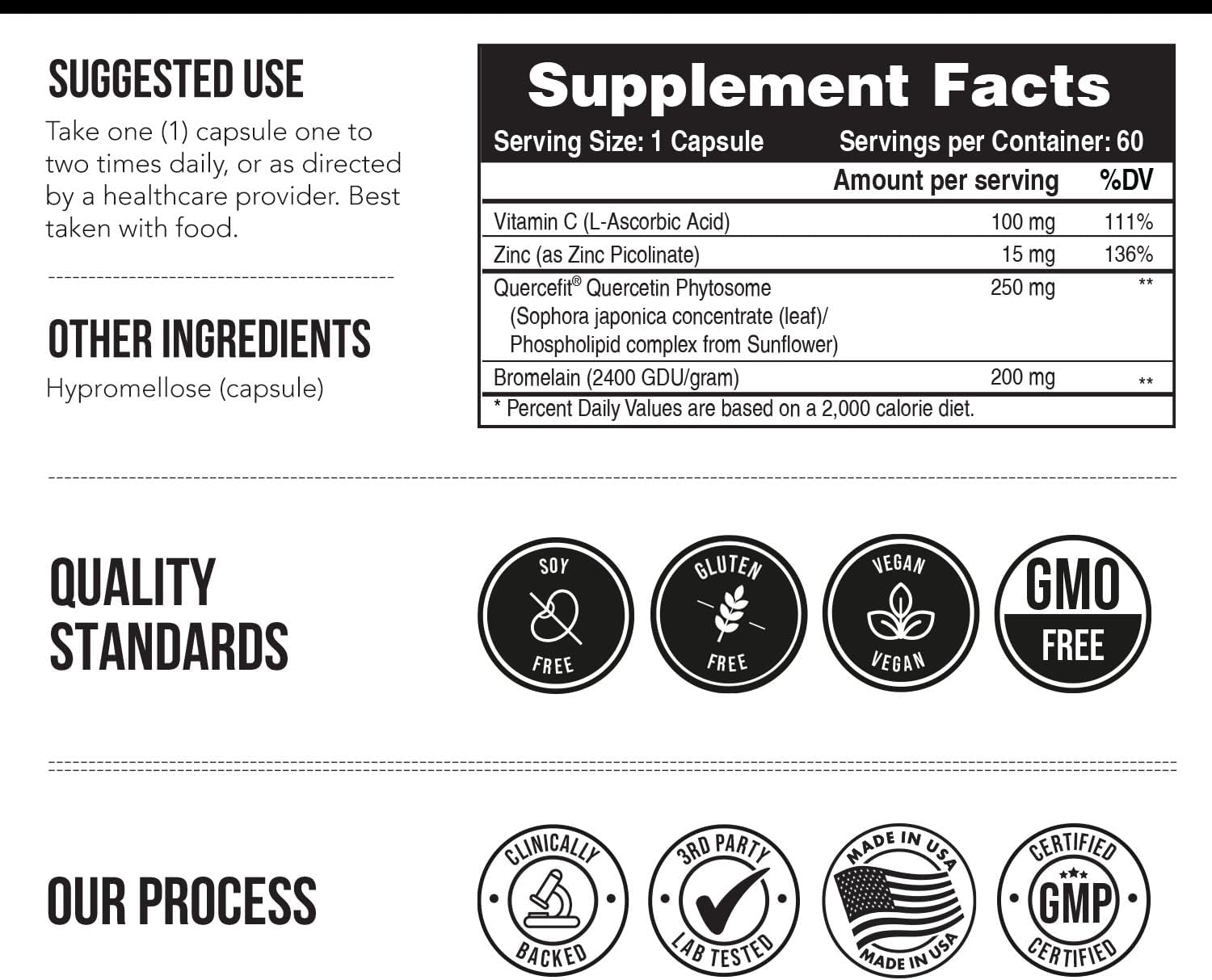 VEGAN, 3RD PARTY TESTED, cGMP MANUFACTURING | Quercetin Complete is vegan, GMO-free, filler-free, soy-free, dairy-free, and preservative-free. It is 3rd party tested for over 100+ contaminates and microbials, and it is manufactured in the USA in the highest quality GMP regulated facility.