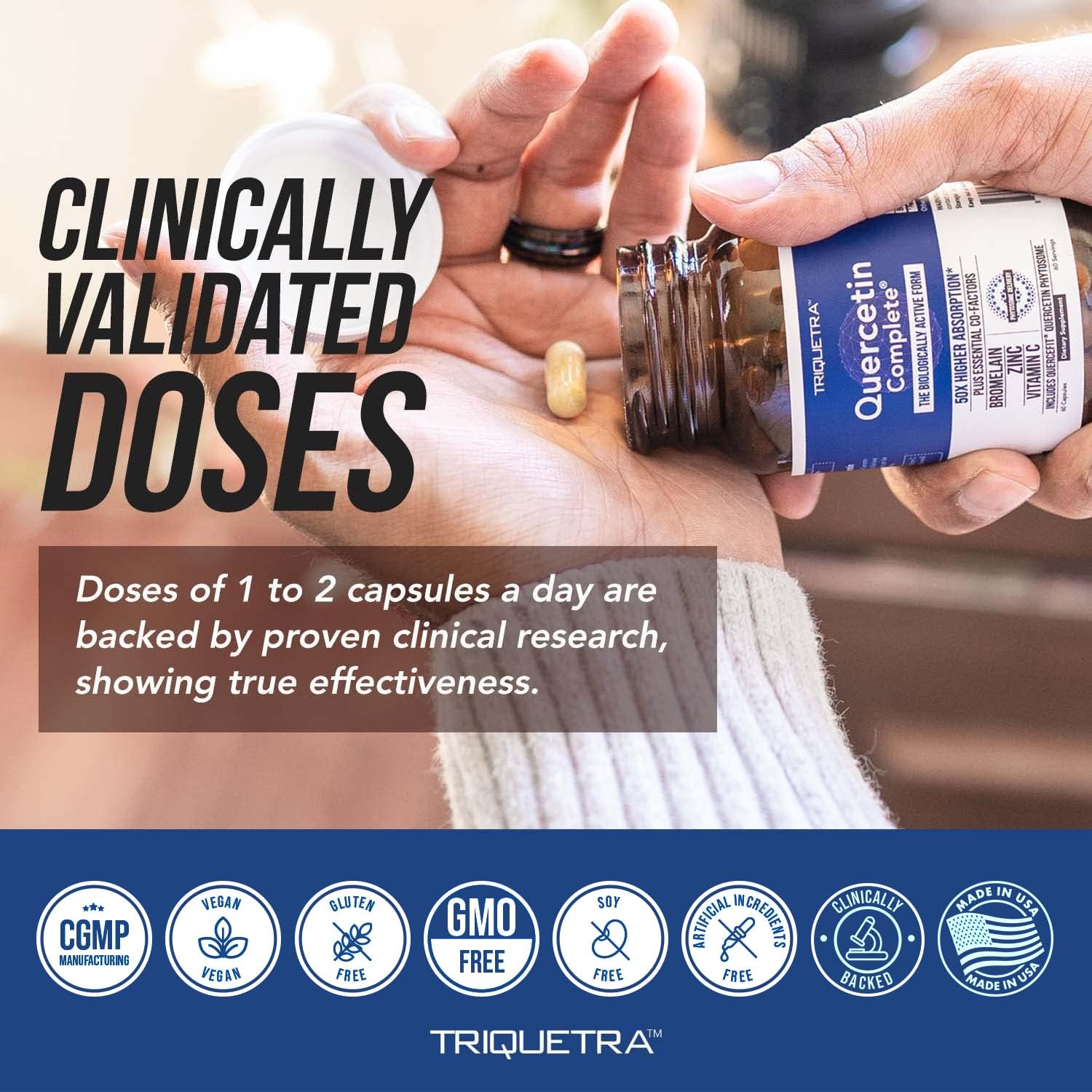 - 7 CLINICAL STUDIES FOR PROVEN HEALTH BENEFITS, CLINICALLY VALIDATED DOSE | There are 7 clinical studies showing our Quercetin Phytsome’s proven ability to deliver tangible and proven health benefits within the body. It is clinically proven to enhance immunity, improve respiratory health, improve seasonal allergies, improve athletic performance and more.* Dosing of 250 mg once or twice daily is clinically validated for proven health benefits.