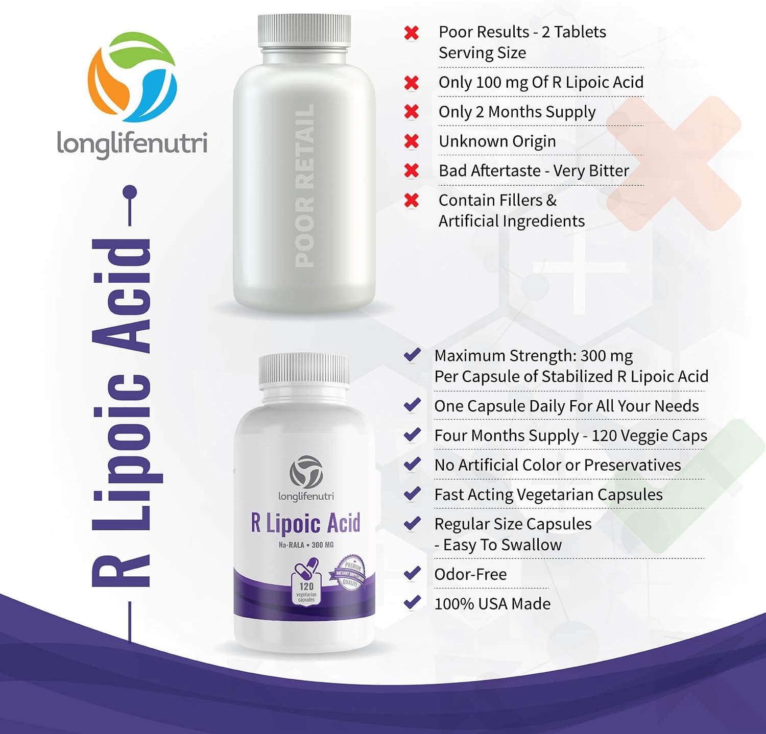 - ✔ PERFECT RECOMMENDED DOSAGE: Just one cap a day of our R Lipoic Aacid delivers the highest recommended dose with the best ingredients - 300 mg per veggie caps. Receive a full R-ALA bottle with 120 vegan caps 3 months supply. Each veg cap has 300 mg and you can increase with 2 caps for 600 mg. EASY TO SWALLOW: Our vcaps are easy to swallow without stomach issues. Try the LongLifeNutri products such as Alpha GPC Choline Berberine Glutathione and more.