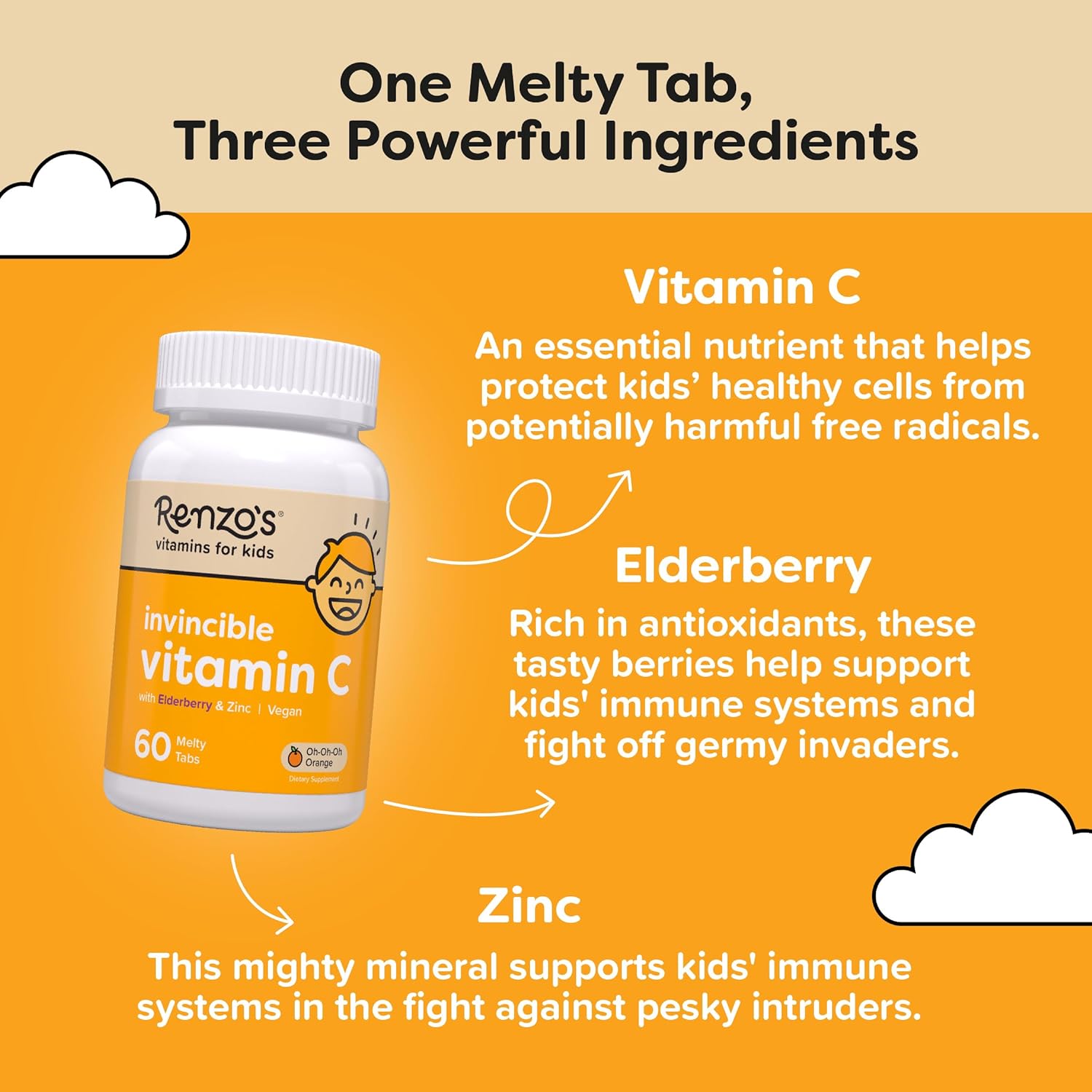 Renzo's Invincible Vitamin C for Kids with Elderberry & Zinc -60 Melty Tabs
