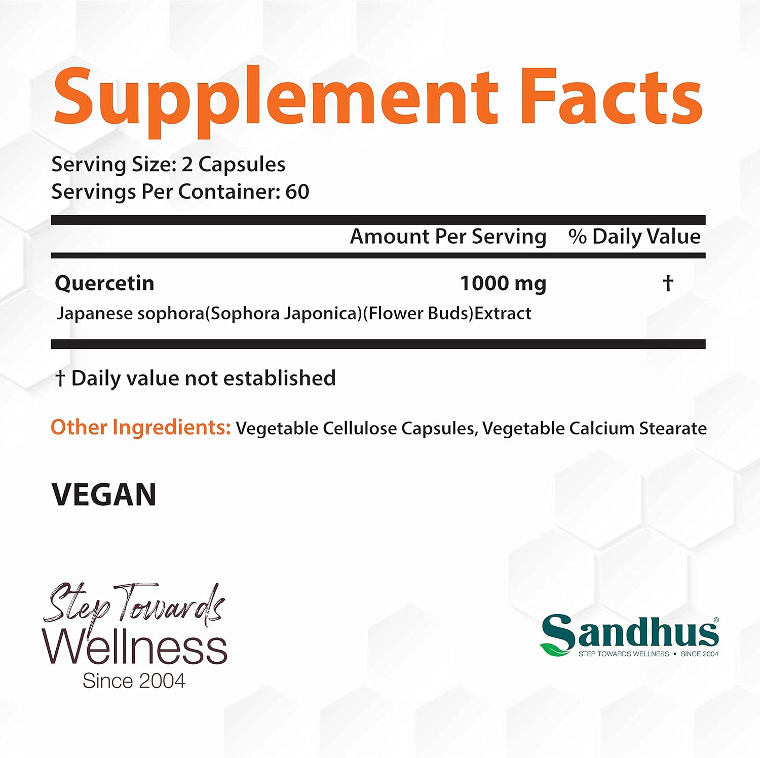 Sandhu's Quercetin 1000mg Per Serving 120 Count Vegetarian Capsules
