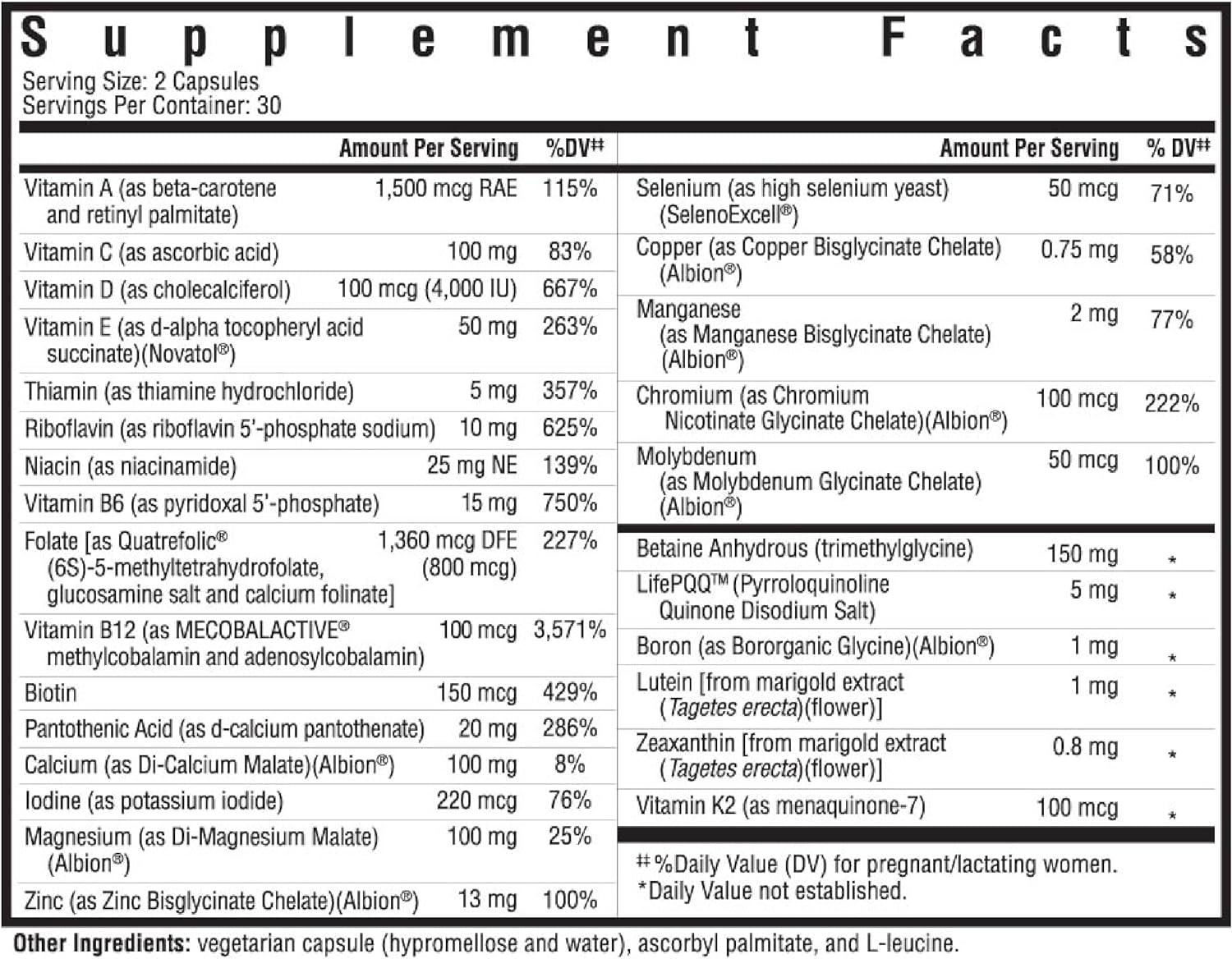 Vitamin A 1,500 mcg RAE, Vitamin C 100 mg, Vitamin D 100 mcg, Vitamin E 50 mg, Thiamin 5 mg, Riboflavin 10 mg, Niacin 25 mg NE, Vitamin B6 15 mg, Folate 1,360 mcg DFE, Vitamin B12 100 mcg, Biotin 150 mcg, Pantothenic Acid 20 mg, Calcium 100 mg, Iodine 220 mcg, Magnesium 100 mg, Zinc 13 mg, Selenium 50 mcg, Copper 0.75 mg,. Manganese 2 mg, Chromium 100 mcg, Molybdenum 50 mcg, Betaine Anhydrous 150 mg, LifePQQ 5 mg, Boron 1 mg, Lutein 1 mg, Zeaxanthin 1 mg, Vitamin K2 100 mcg.%Daily Value (DV) for pregnant/lactating women. Zinc (as Zinc Bisglycinate Chelate) (Albion*)13 mg 100%*Daily Value not established. Other Ingredients: vegetarian capsule (hypromellose and water), ascorbyl palmitate, and L-leucine.