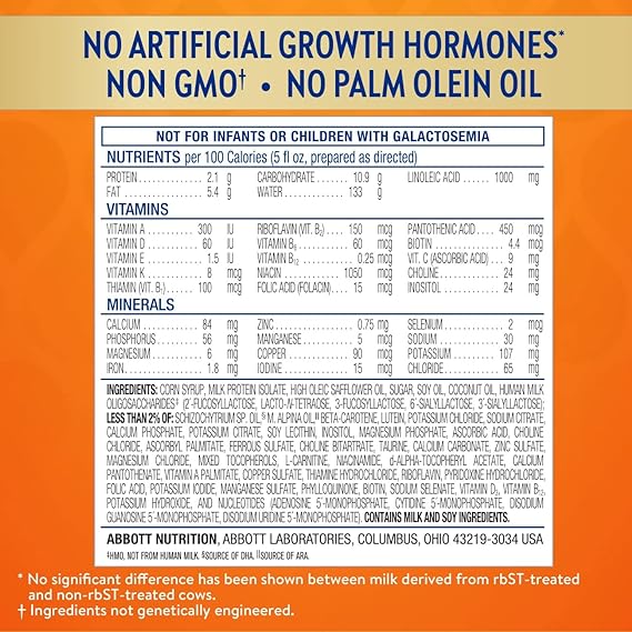 NO ARTIFICIAL GROWTH HORMONES & NON-GMO§: Similac is the first leading infant formula brand with no artificial growth hormones; contains ingredients that are not genetically engineered