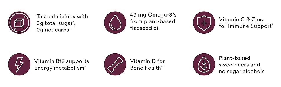 - Vitamins contain 19 nutrients including Omega-3 (sourced from plant-based flaxseed oil), Vitamin D3 and Zinc for immune support, Vitamin B12 supports energy metabolism and Vitamin D for bone health.