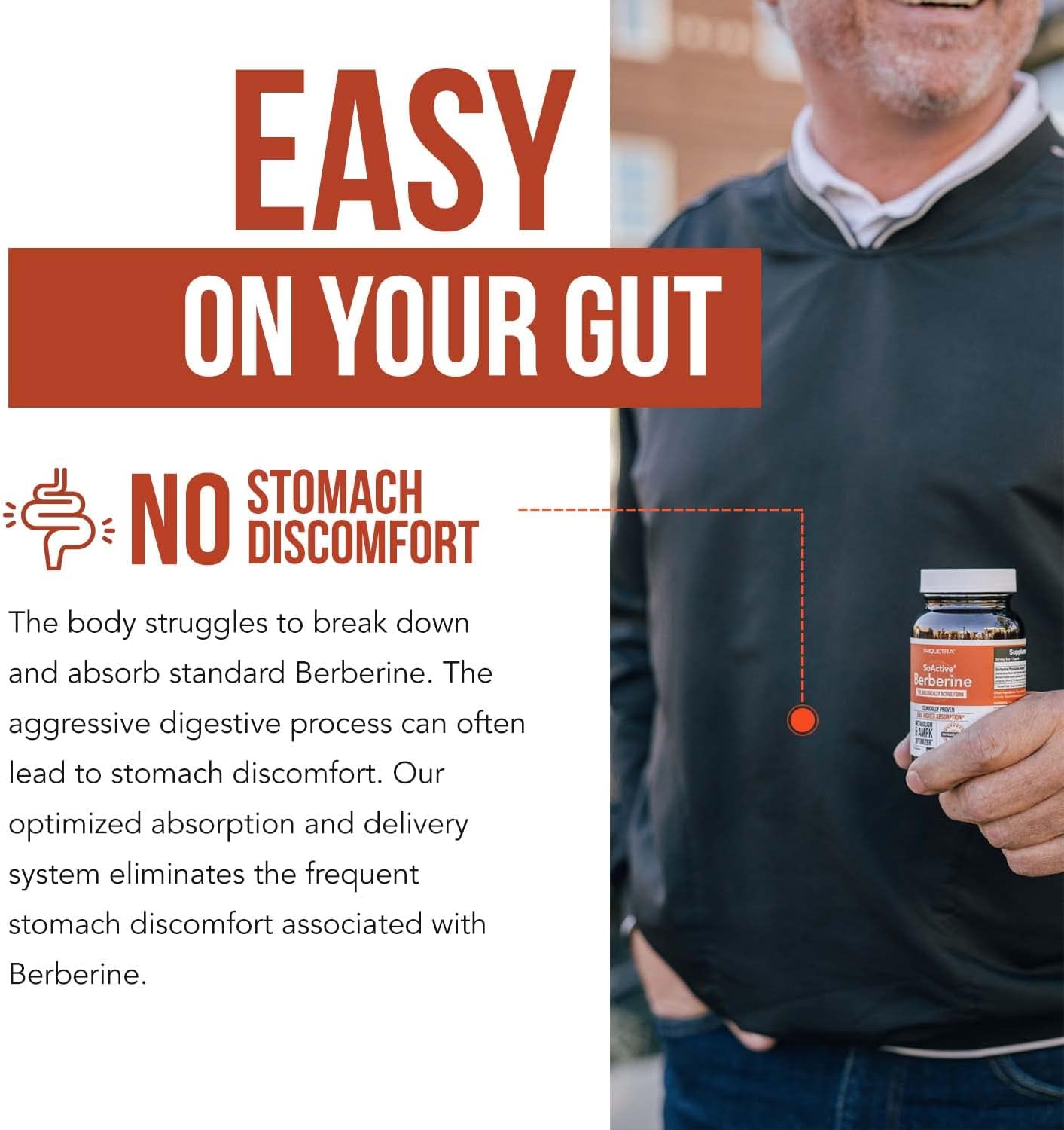 - NO STOMACH DISCOMFORT: The body struggles to breakdown and absorb standard Berberine; the aggressive digestive process can often lead to stomach discomfort. Our optimized absorption and delivery system eliminates the frequent stomach discomfort associated with Berberine.
