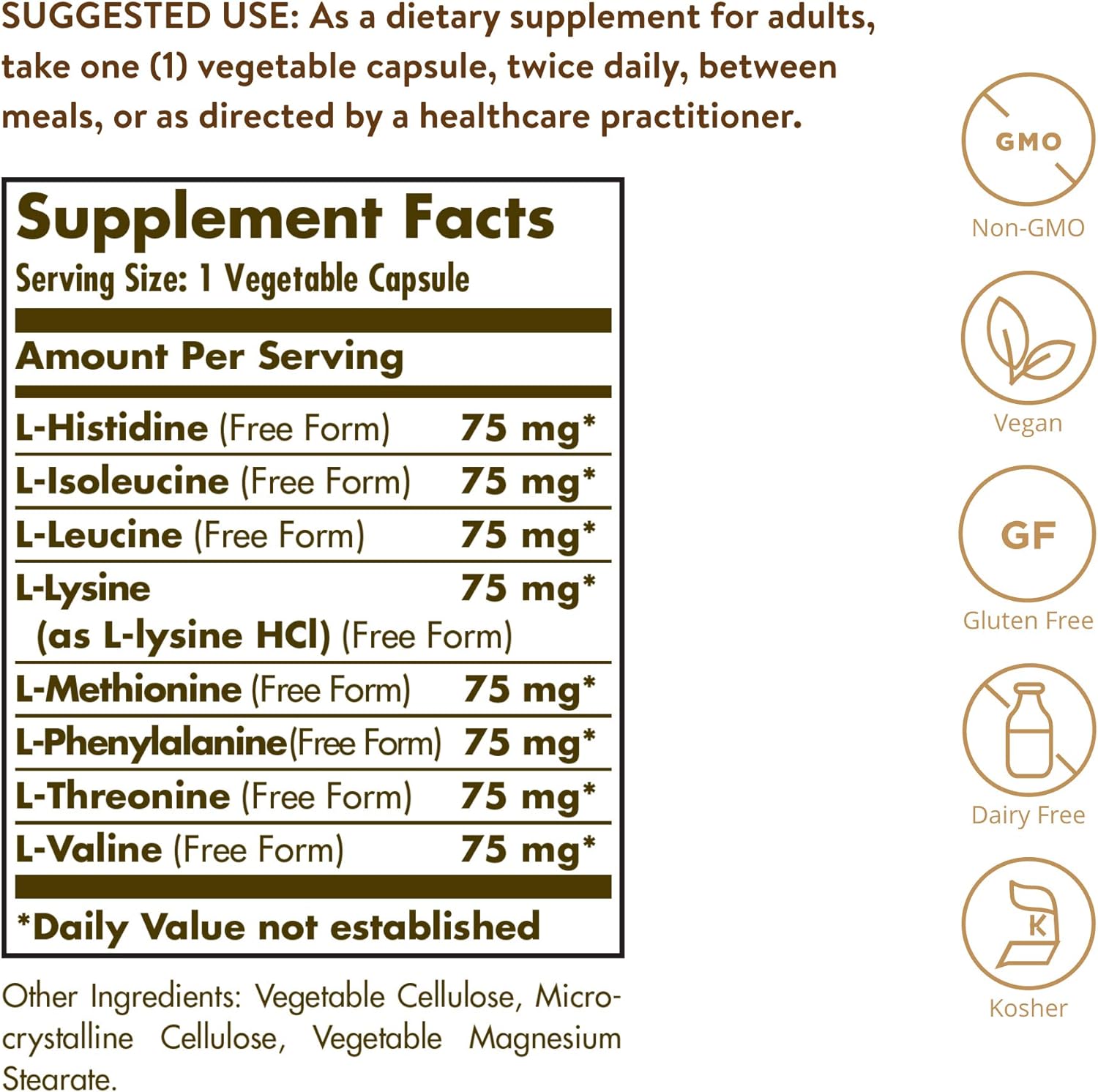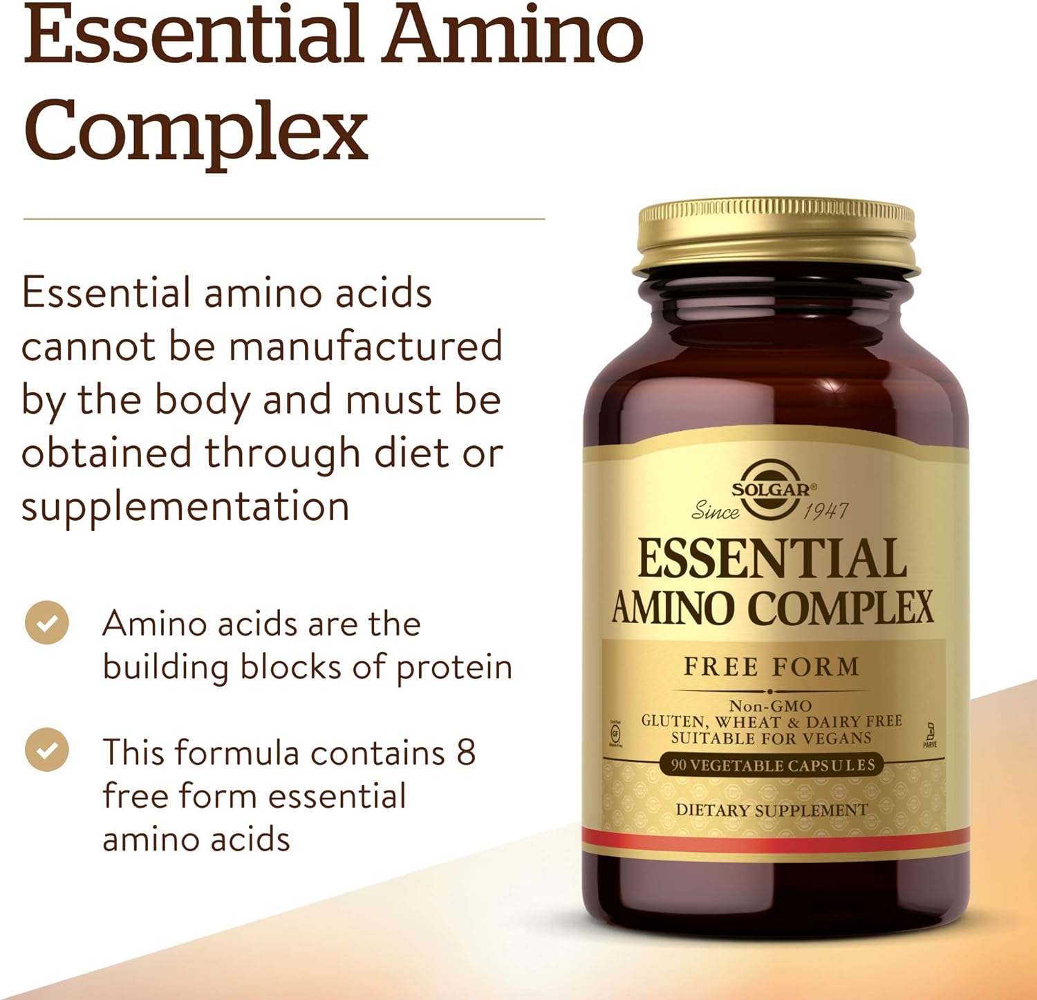 - Gluten, Wheat & Dairy Free; Solgar Essential Amino Complex is non-GMO, vegan, kosher, and free of: gluten, wheat, dairy, soy, yeast, sugar, sodium, artificial flavor, sweetener, preservatives and color; Suitable for vegetarians