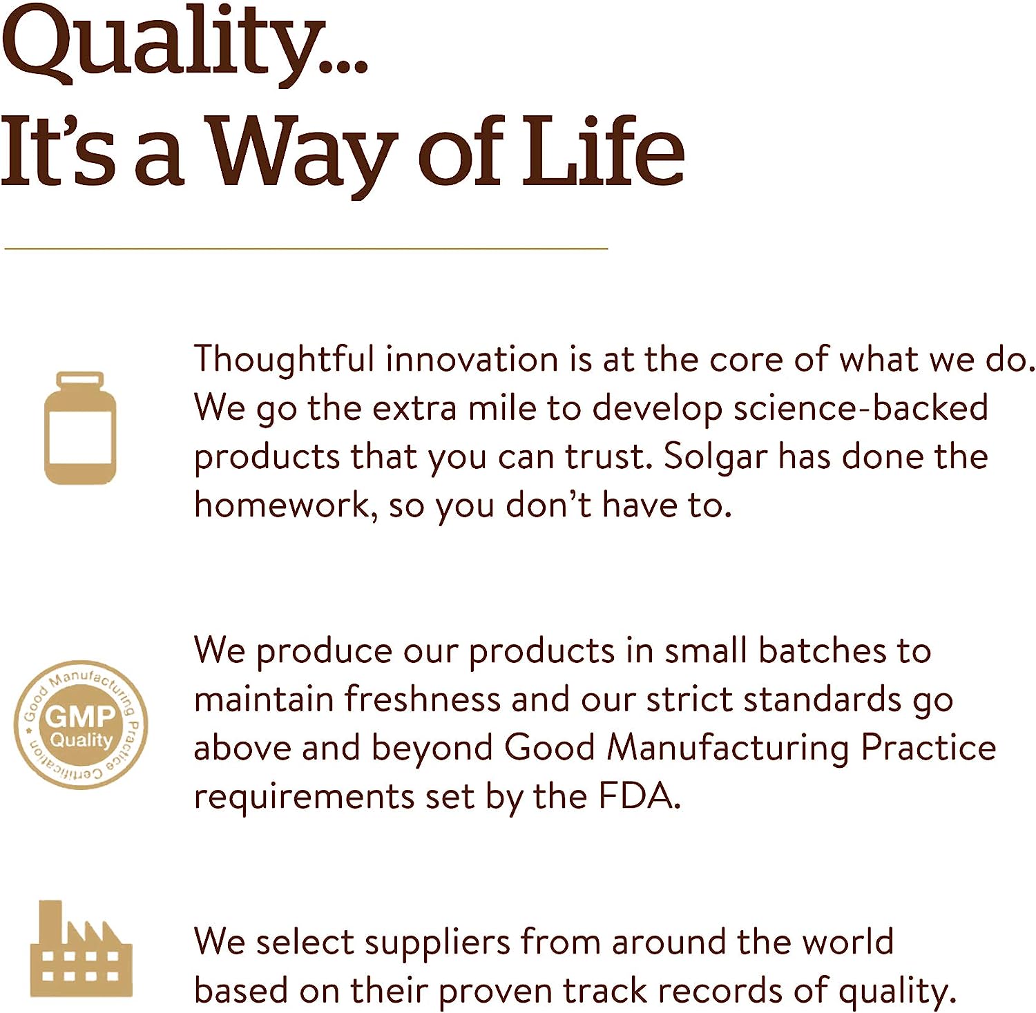 - The Gold Standard; For over 70 years, Solgar has been committed to quality, health, and well-being. Our mission is to create the finest nutritional supplements in small batches, through tireless research, using only the finest raw materials
