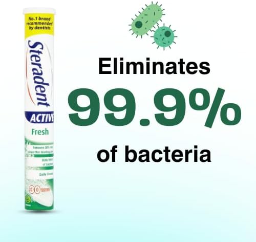 Directions: Suitable for cleaning both full and partial dentures. Safe for metal parts and will not cause corrosion. Directions: For optimum cleaning results we recommend using Steradent All in 1 Active Fresh twice a day. 1. Rinse denture. Place one Steradent All in 1 Active Fresh tablet together with your denture in a glass. Replace cap firmly after use. 2. Fill with warm water to cover dentures and soak for 10 minutes. DO NOT USE BOILING WATER STRAIGHT FROM THE KETTLE AS THIS WILL DAMAGE DENTURES. 3. Rinse denture in water thoroughly before wearing. 4. Dispose of the solution after use and rinse the glass. WARNING: For soaking dentures only. DO NOT PLACE TABLETS IN MOUTH. DO NOT DRINK THE SOLUTION. If accidentally swallowed seek medical advice immediately. If spilt or splashed, rinse well with water. Do not dissolve with any other denture cleansers. Not recommended for users with known hypersensitivity to any ingredient. In case of contact with eyes rinse immediately with plenty of water and seek medical advice. Dispose of solution and unwanted tablets responsibly.