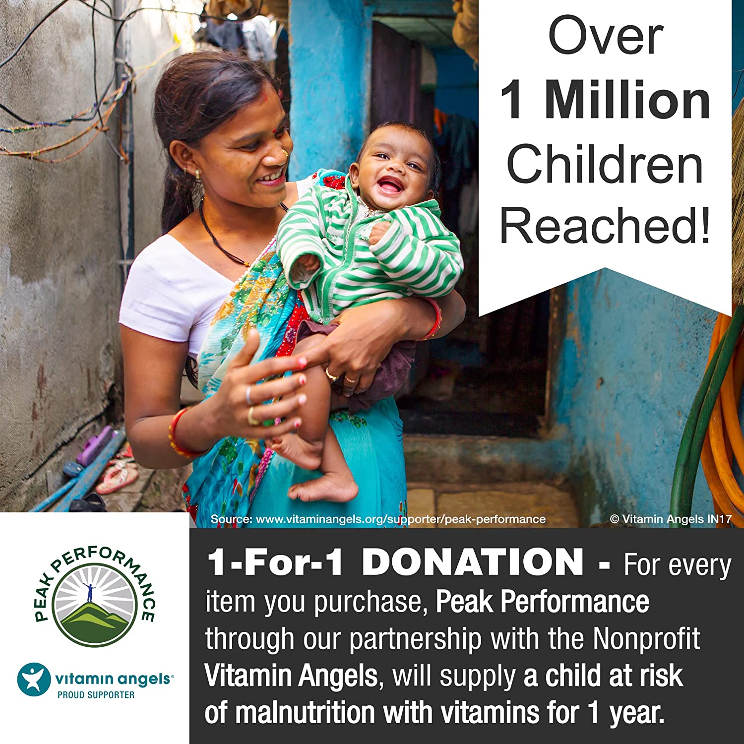 Over 800,000 Customers + 1-for-1 Donation To Vitamin Angels. Peak Performance is celebrating over 800,000 customers and we are also very proud of our 1-for-1 donation match program. For every unit you purchase, through our partnership with the nonprofit Vitamin Angels, we will supply a child at risk of malnutrition with vitamins for 1 year! To date, we've supplied over 1 Million children with life changing Vitamins- So thank you for helping us continue this great cause!