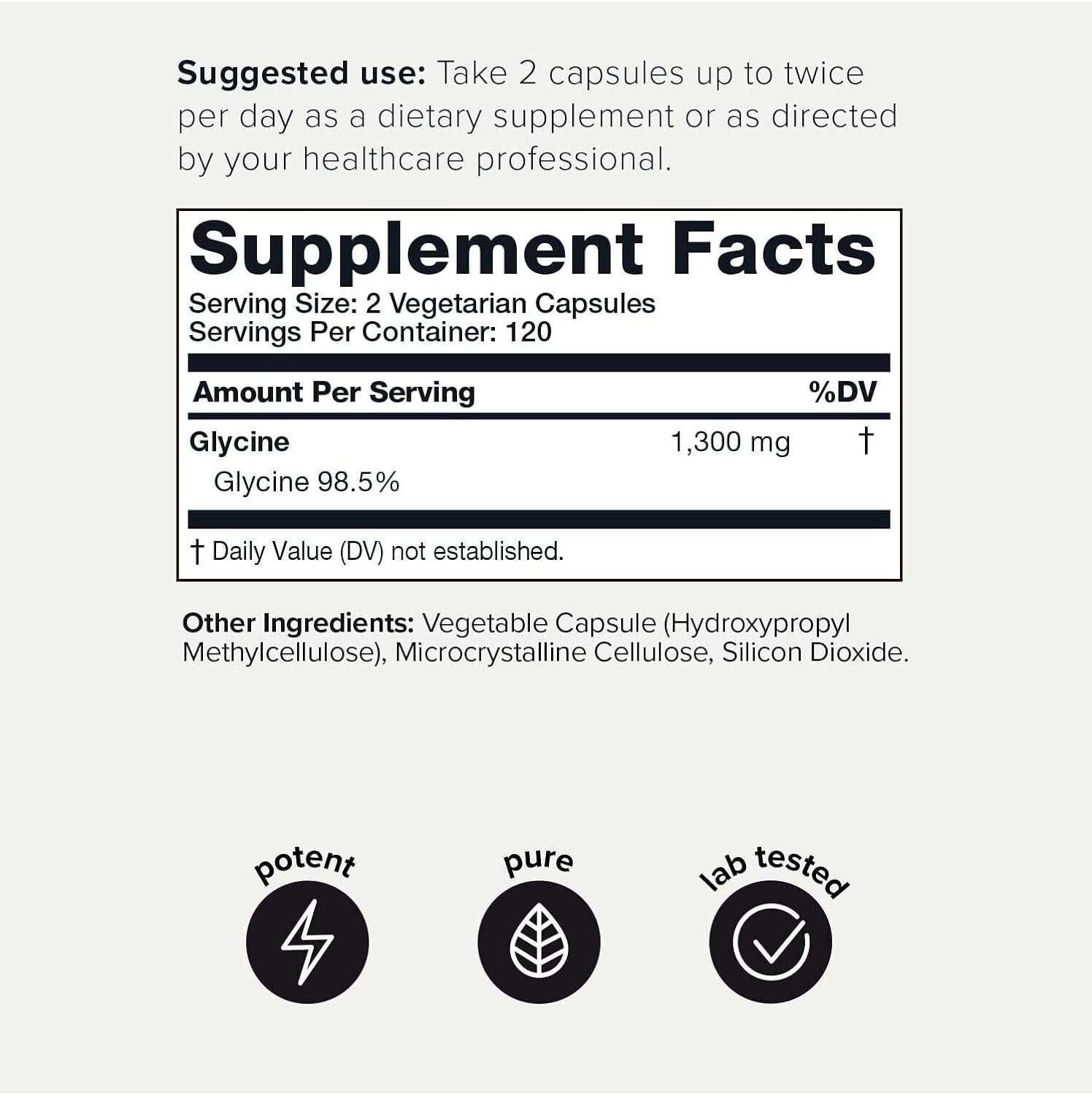 | Material Feature | 1300mg Glycine Supplement; Min. 98.5%+ Tested Purity; 3rd Party Tested; 4 Month Supply |
