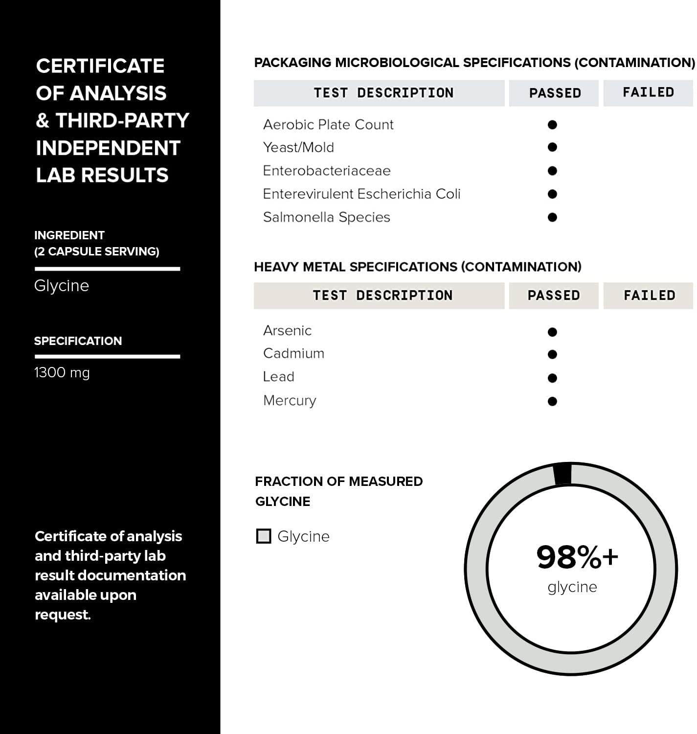 - The Highly Purified Form of Glycine - Batches are third-party lab tested to ensure a minimum of 98.5% purity in every serving, meaning you are not just getting the highest dosage of glycine, but also the purest (most other glynac supplement and glycine 1000mg capsules won’t reveal their purity levels).