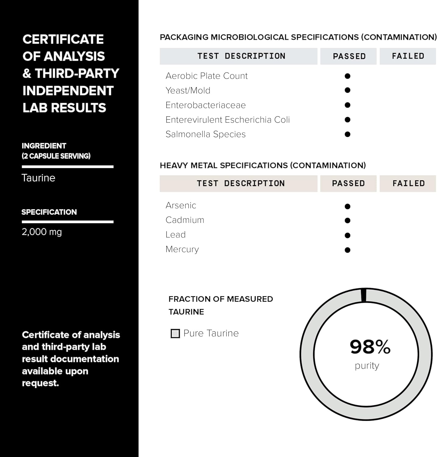 | Material Feature | High Purity Taurine Powder Capsules - 2000mg; 98%+ Pure, Third-Party Lab Tested |