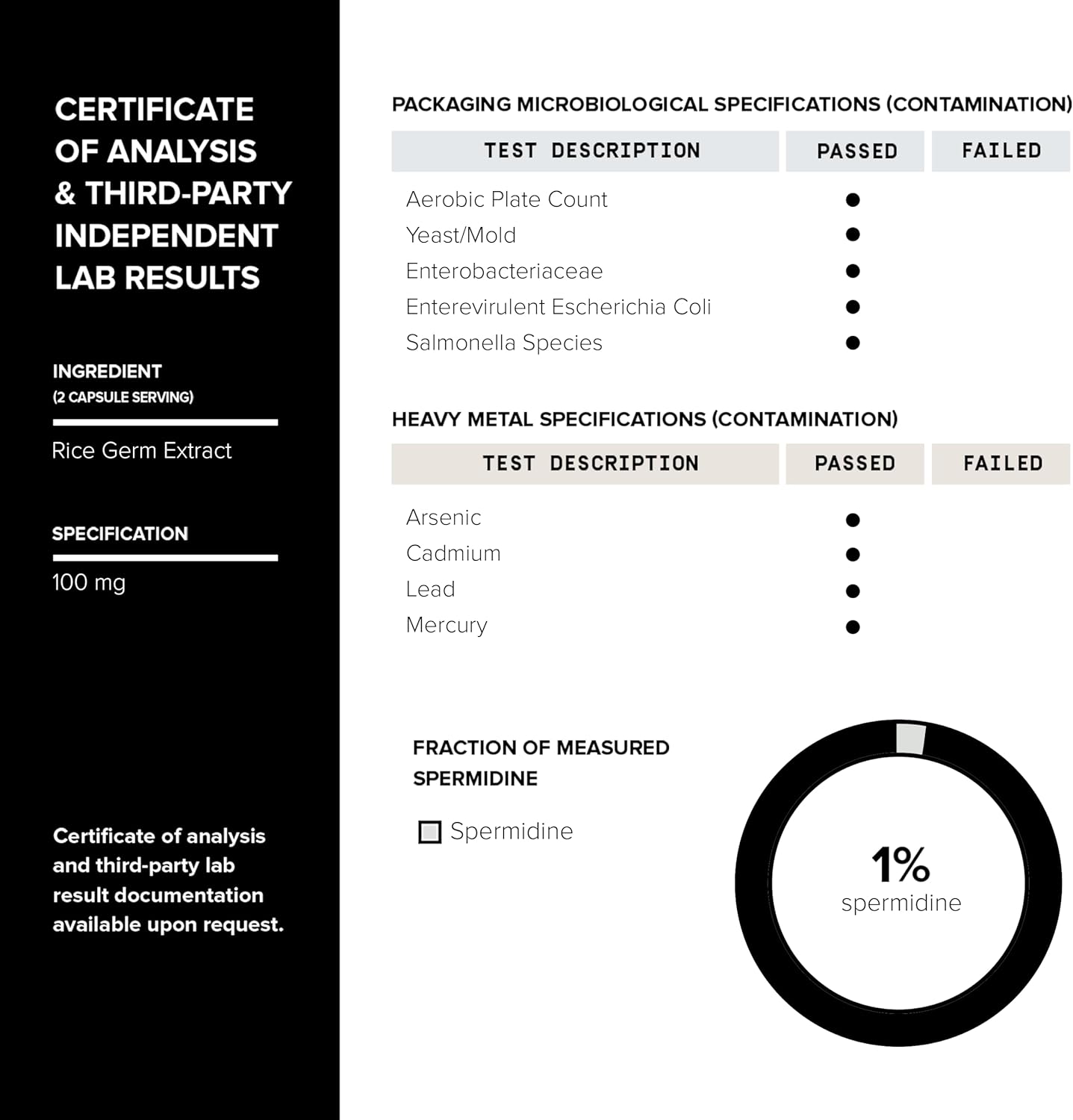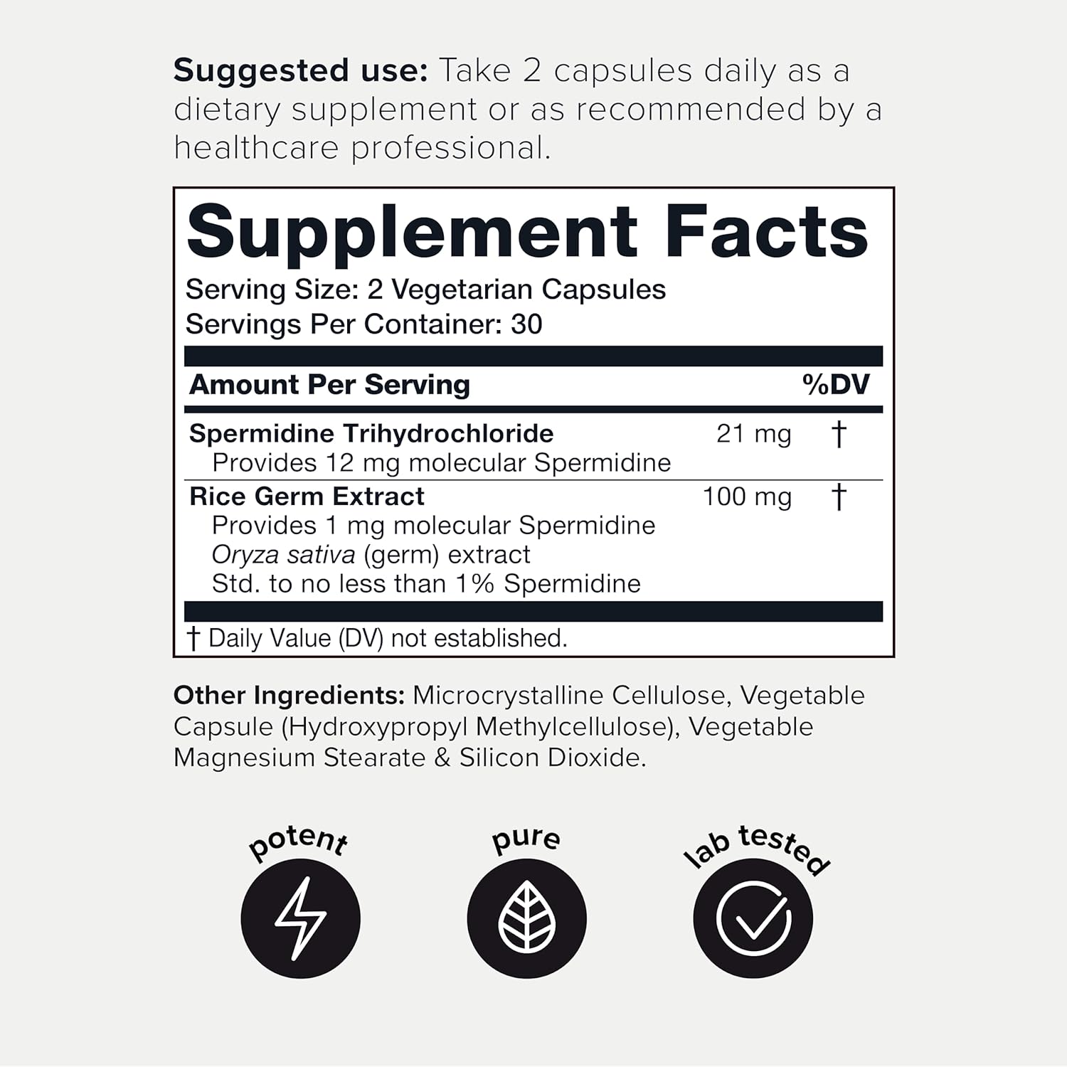 - Additional Polyamine Benefits - Our Spermidine complex is enhanced with 100mg of rice germ extract, providing a natural source of additional spermidine while also ensuring the studied benefits of naturally occurring polyamines.