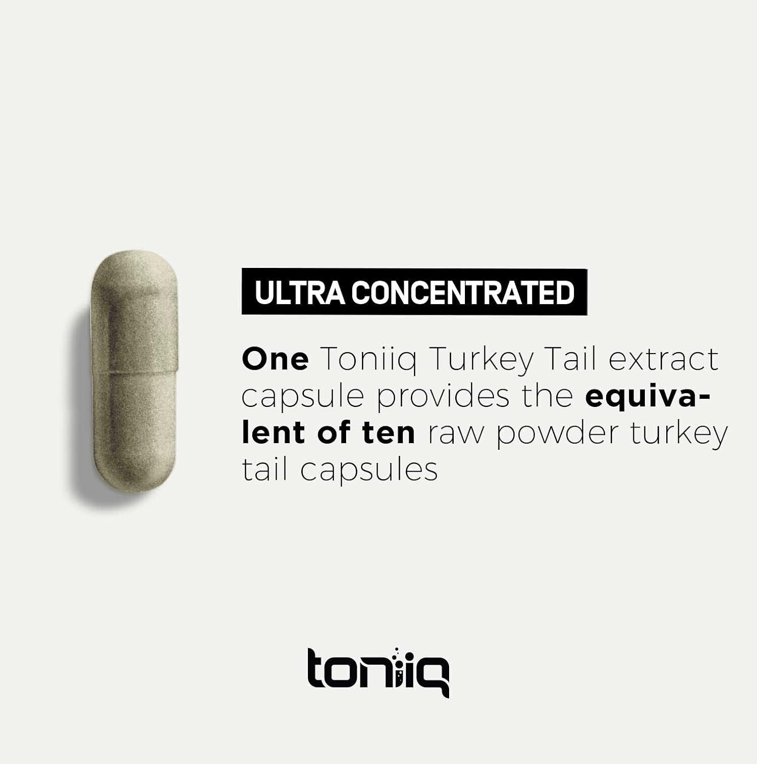 - Made From Pure Full-Spectrum Fruiting Bodies - Beta Glucans are renowned for their health-promoting effects, something other Turkey Tail mushroom capsules don’t provide in high doses as it requires an extra step (and expense) in the manufacturing process. With 10X concentration in Toniiq Turkey Tail, you are getting one of the most optimal Turkey Tail products on the market.