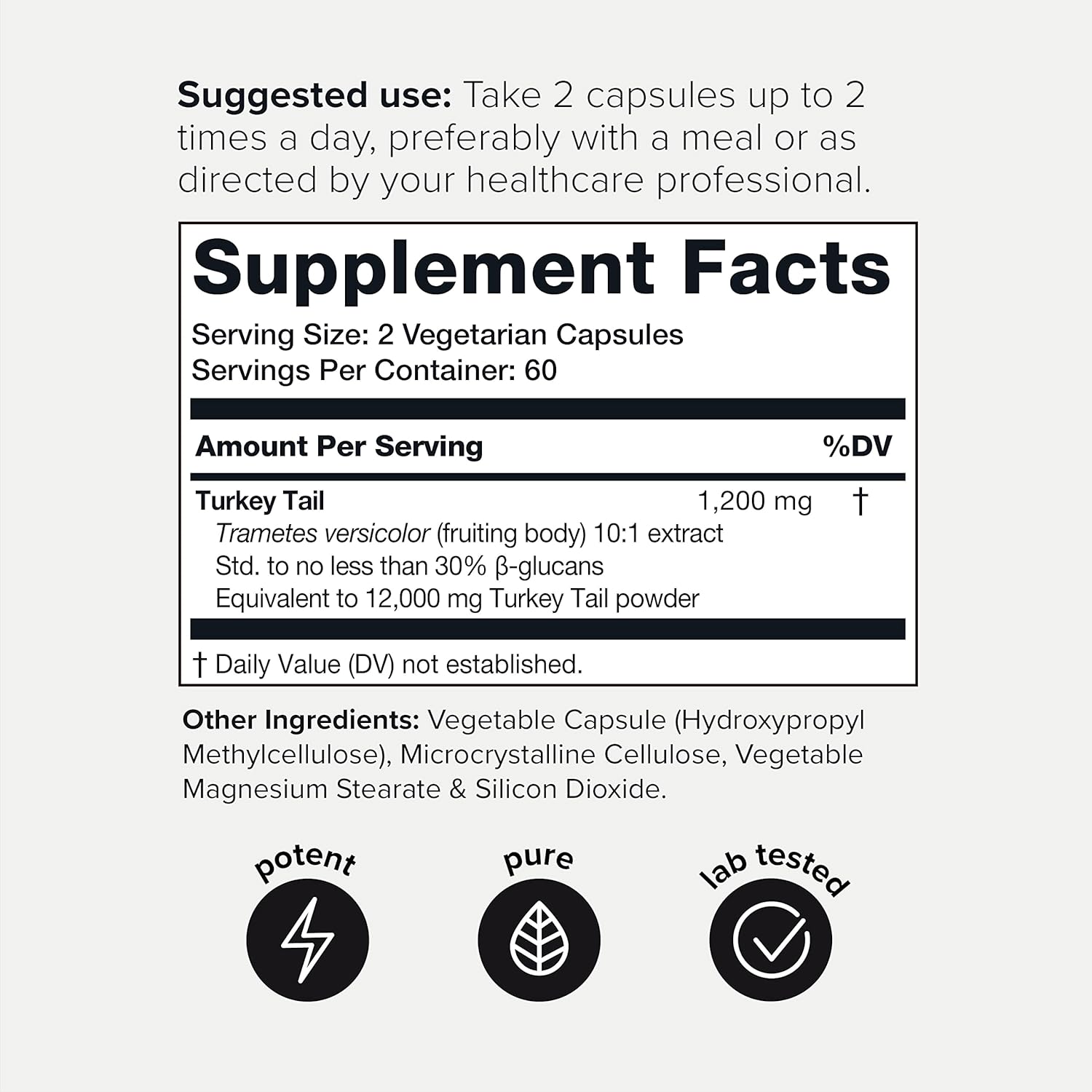 | Material Feature | Ultra High Strength Turkey Tail Mushroom Extract 1200mg (Equivalent to 12,000mg of Turkey Tail Powder); 30% Beta Glucans;10x Concentrated; 3rd Party Tested;Ultra High Strength Turkey Tail Mushroom Extract 1200mg (Equivalent to 12,000mg of Turkey Tail Powder); 30% Beta Glucans;10x Con… See more |