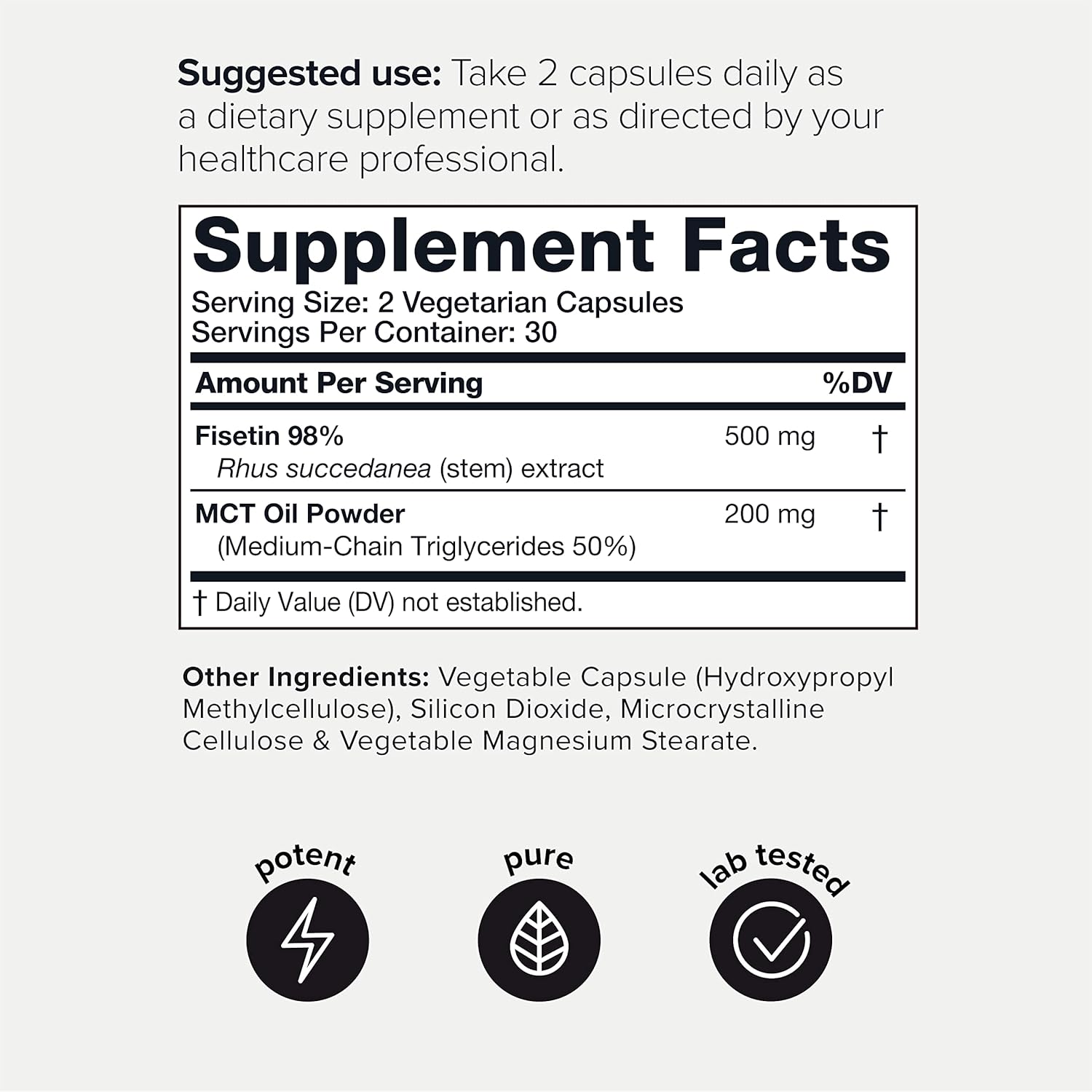 | Product Benefits | Fisetin 500mg; 98%+ Higly Purified; With MCT Oil for Absorption; 3rd Party Tested; |