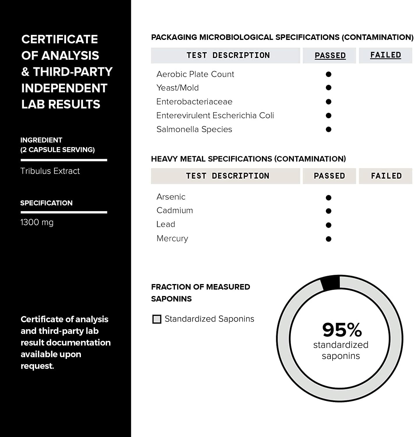 | Material Feature | Tribulus Terrestris 1300mg Concentrated Extract Formula, 25:1 Extract - 95% Steroidal Saponins; 3rd Party Tested; 60 ServingsTribulus Terrestris 1300mg Concentrated Extract Formula, 25:1 Extract - 95% Steroidal Saponins; 3rd Party Tested; 60 Servings |