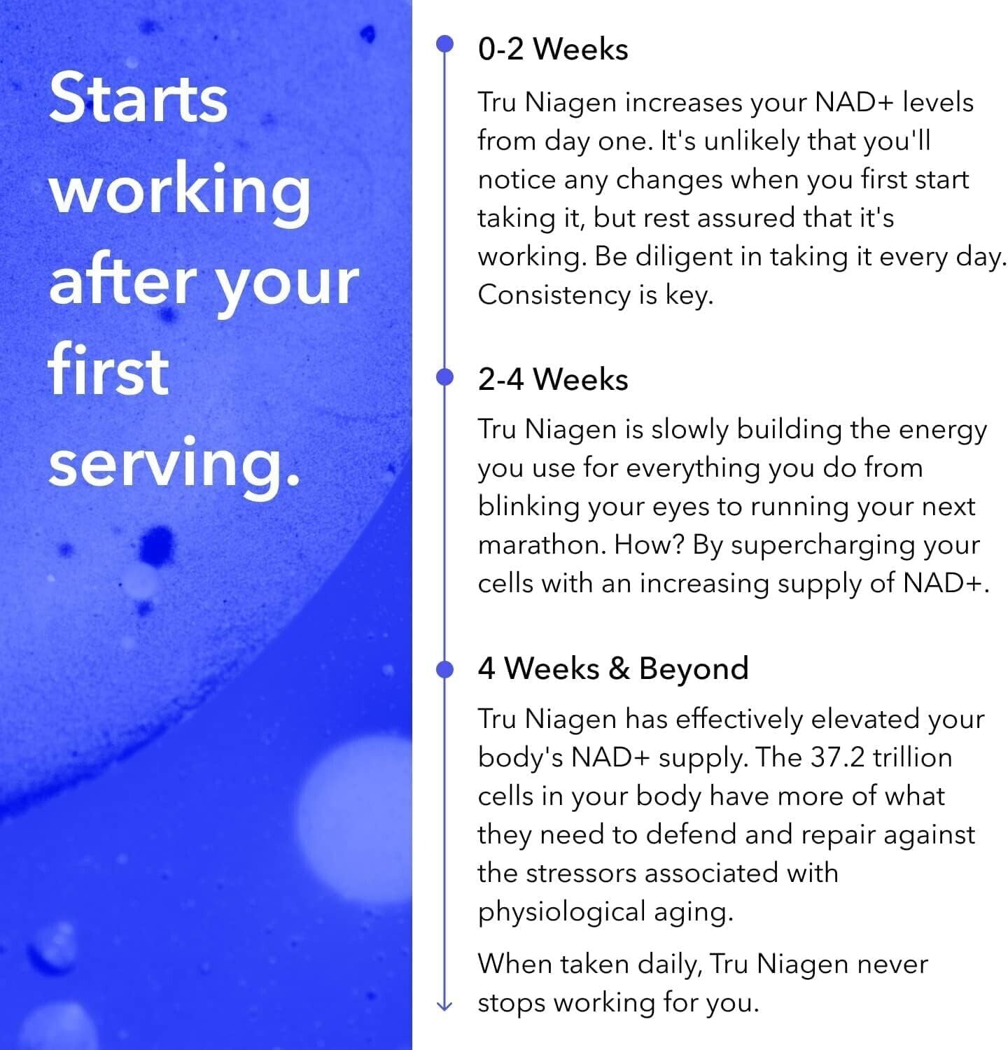 - Scientifically proven: With consistent daily use, Tru Niagen is proven to raise NAD+ levels, as is shown by multiple published clinical trials, with 40+ registered human studies ongoing. In addition, studies support that Niagen (the key ingredient in Tru Niagen) is more efficient at raising NAD+ levels than nicotinamide/niacinamide, and niacin. The chemical structure of Niagen allows for more efficient absorption and utilization than other NAD+ precursors.