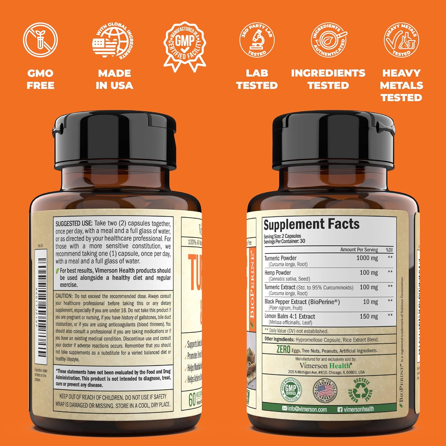 Turmeric Powder (Curcuma Longa, Root) 1000mg, Hemp Powder (Cannabis Sativa, Seed) 100mg, Turmeric Extract (Std to 95% Curcuminoids) (Curcuma Longa, Root) 100mg, Lemon Balm 4:1 Extract (Melissa Officinalis, Root) 150mg, Black Pepper Extract (BioPerine®) (Piper Nigrum, Fruit) 10mg. Other Ingredients: Hypromellose Capsule, Rice Extract Blend.