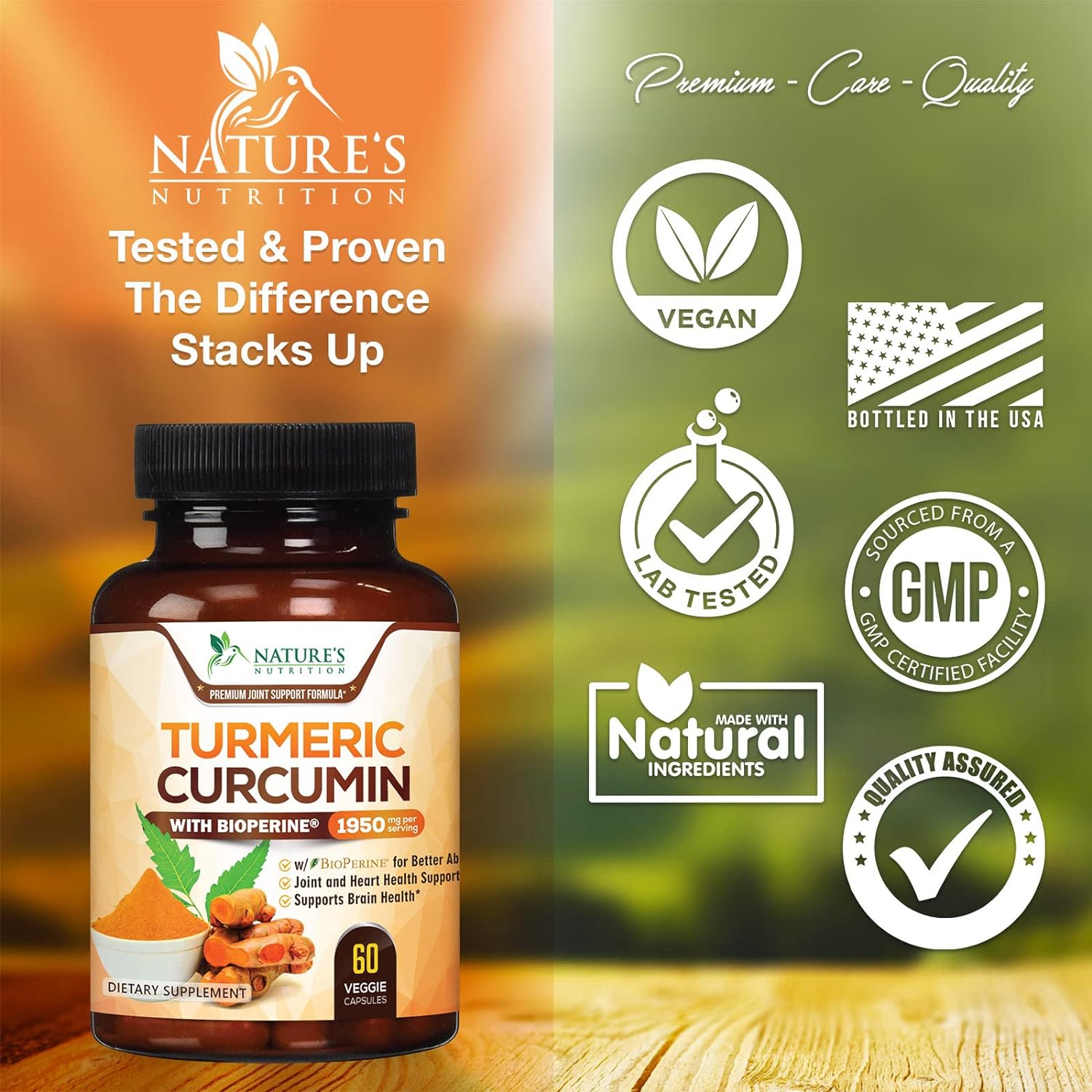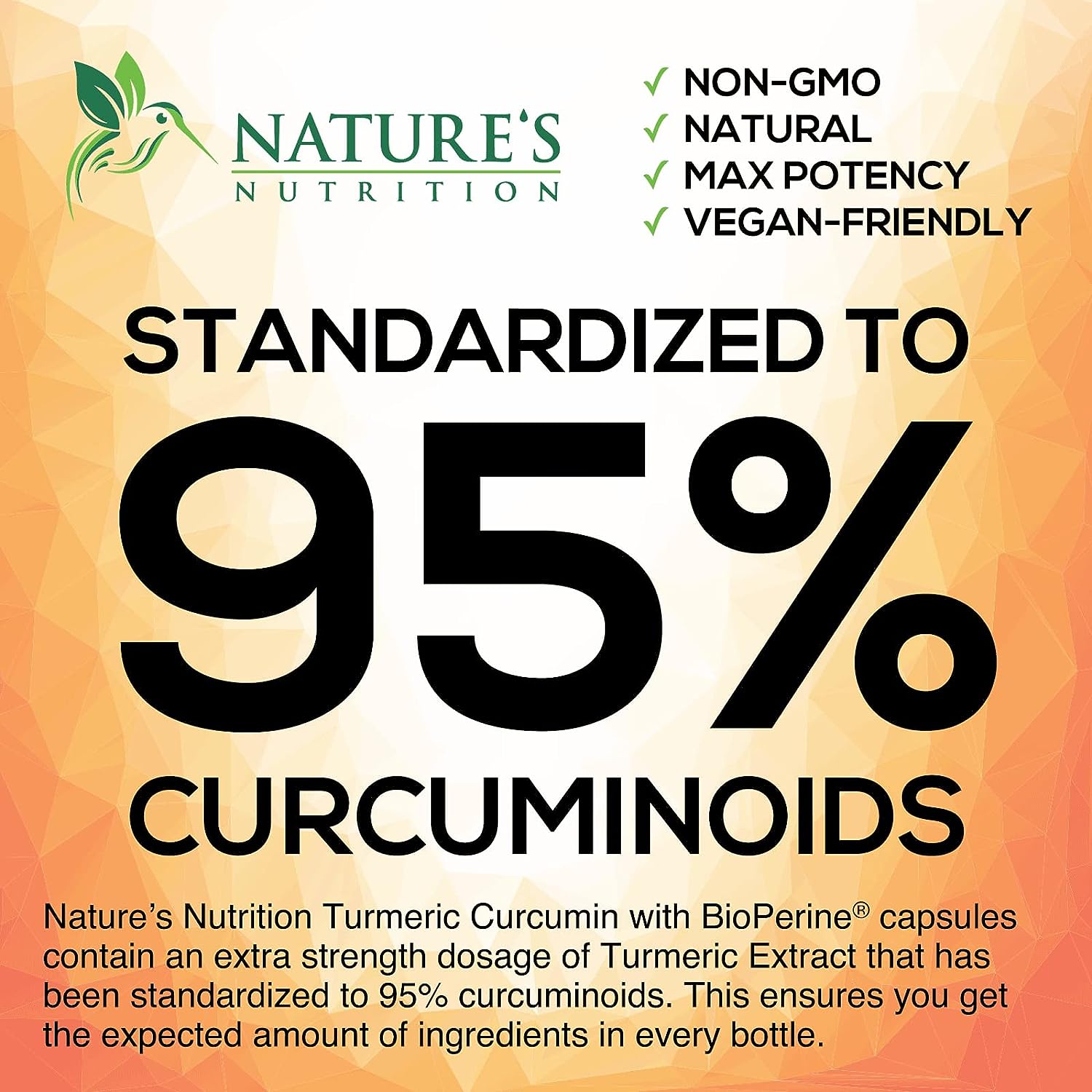 Nature's Nutrition premium Turmeric Curcumin has been shown to support joint health. Our Turmeric supplement features extra strength 95% standardized curcuminoids, with BioPerine (black pepper extract) for improved turmeric absorption.