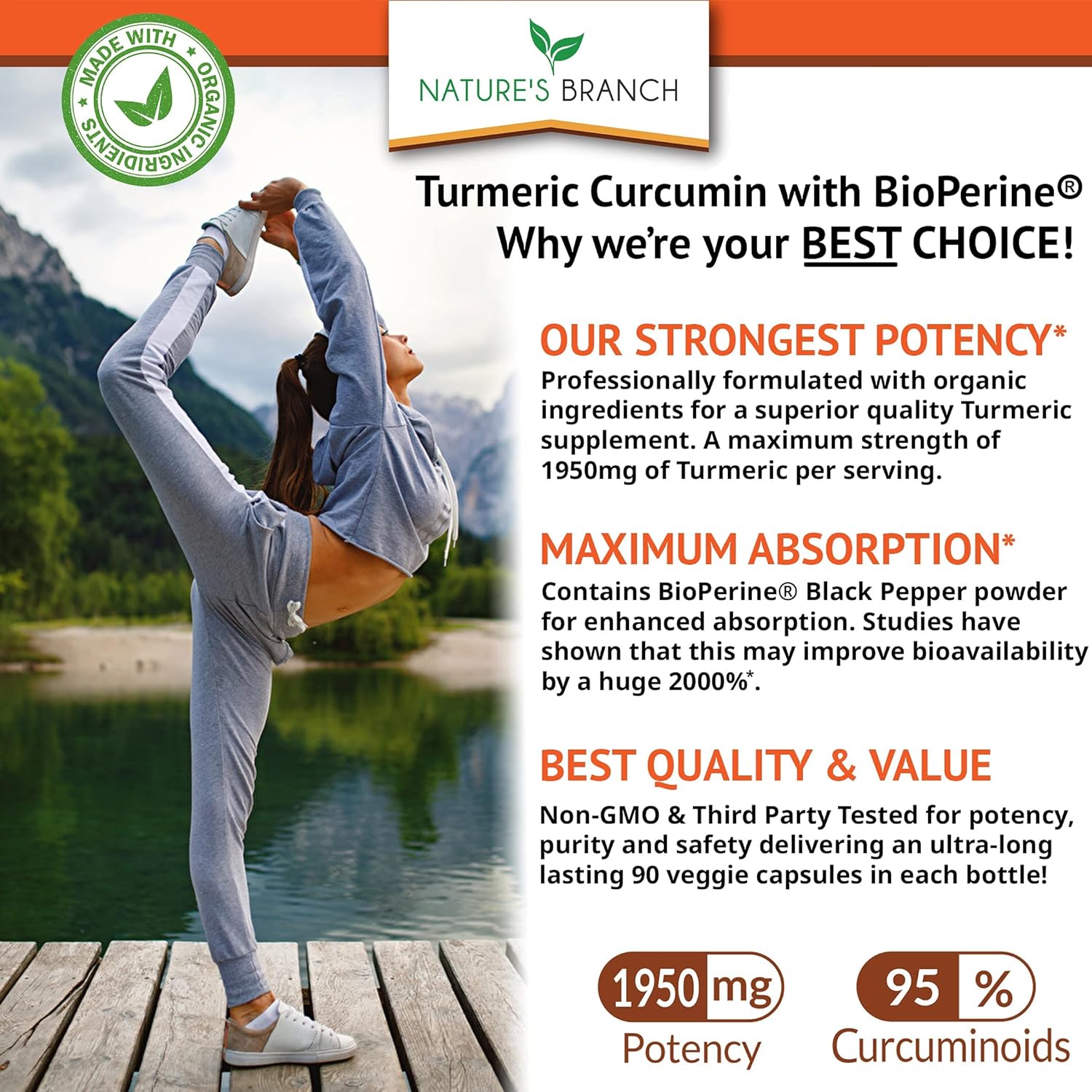- ✅ ALL NATURAL & MADE IN THE USA Nature's Branch turmeric supplements contain turmeric bioperine with raw curcumin - 95% standardized curcuminoids and are made in a GMP CERTIFIED facility for the HIGHEST QUALITY, POTENCY & PURITY*. Completely free from artificial colors for an ALL NATURAL NON GMO anti-oxidant turmeric extract supplement. Our highest grade turmeric pills at the BEST VALUE.