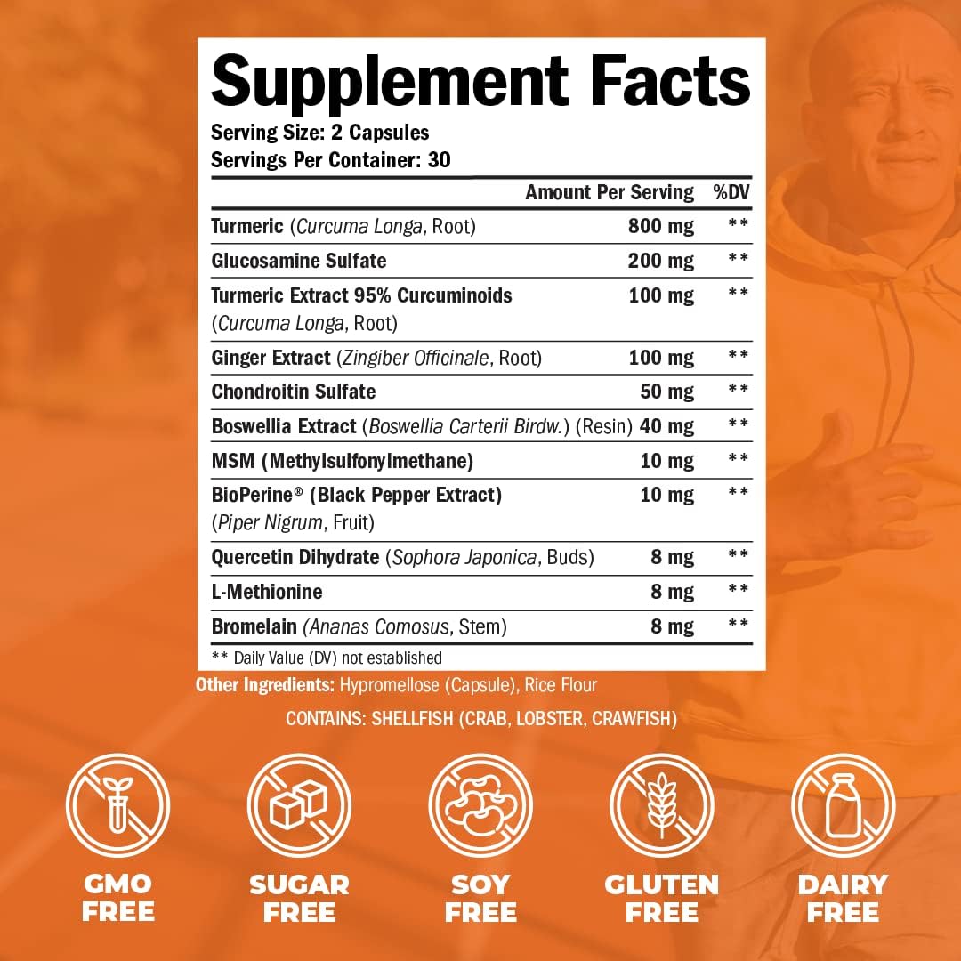 Turmeric (Curcuma longa, root) 800mg, Glucosamine Sulfate 2KCI 200mg, Turmeric Extract 95% curcuminoids (Curcuma longa, root) 100mg, Ginger Extract (Zingiber officinale, root) 100mg, Chondroitin Sulfate 50mg, Boswellia Extract (Boswellia carteri Birdw.) (resin) 40mg, MSM (Methylsulfonylmethane) 10mg, BioPerine (Black Pepper Extract) (Piper nigrum, fruit) 10mg, Quercetin Dihydrate (Sophora japonica, buds) 8mg, L-Methionine 8mg, Bromelain (Ananas comosus, stem) 8mg, Hypromellose (capsule), Rice flour.