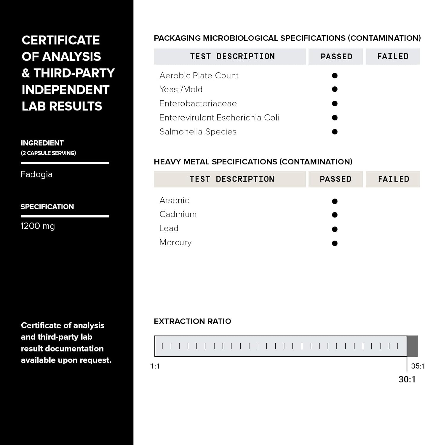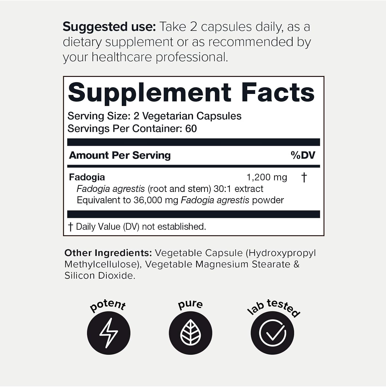 - The Highest Dosage (At the Greatest Value) - Batches are third-party lab tested at the raw ingredient level, and the finished goods level to ensure a minimum of 1200mg of pure fadogia in every serving, meaning you are not just getting the highest concentration, but also some of the most verified purest fadoogia ingredient material than you would in other fadogia agrestis and tongkat ali supplement blended products.