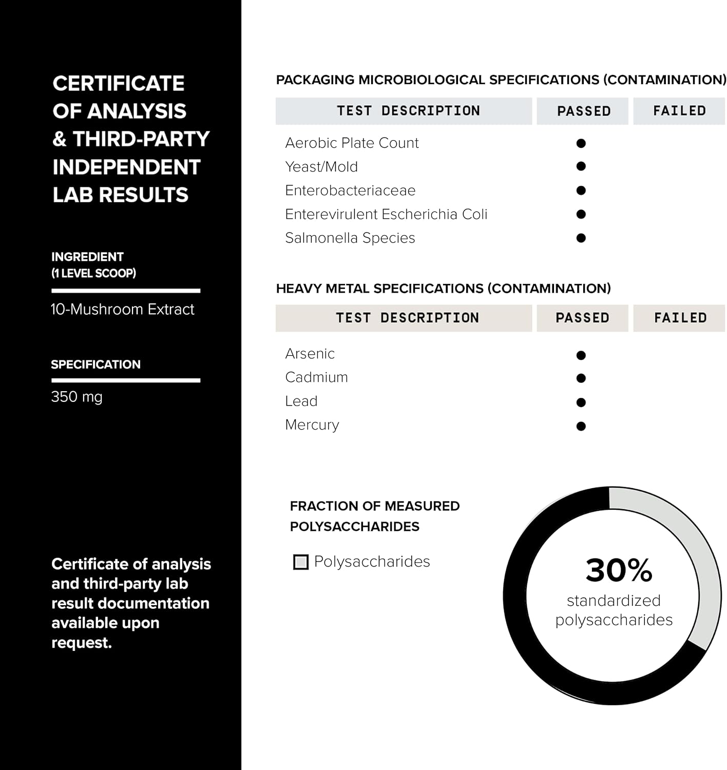 Turkey Tail extract, Lion’s Mane extract, Cordyceps extract, Reishi extract, Oyster Mushroom extract, Shiitake extract, Maitake extract, Chaga extract, Tremella extract, Agaricus blazei extract, Instant Coffee (Coffea arabica) Powder