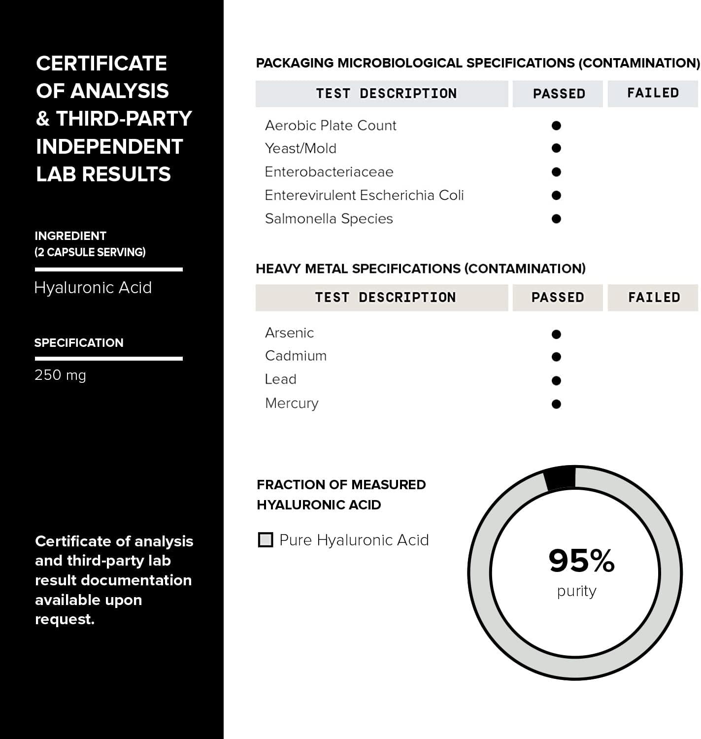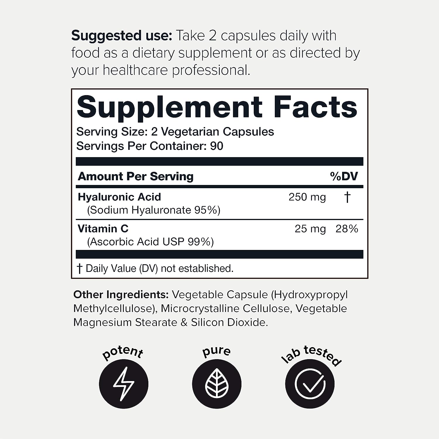 - The Highly Purified Form of Hyaluronic Acid - Toniiq Hyaluronic Acid capsules contain 250mg of the highest quality hyaluronic acid powder in each serving – ethically sourced, grown and produced using a fermented production process to ensure 95% standardized purity (other hyaluronic acid supplement products won't disclose their level of purity).
