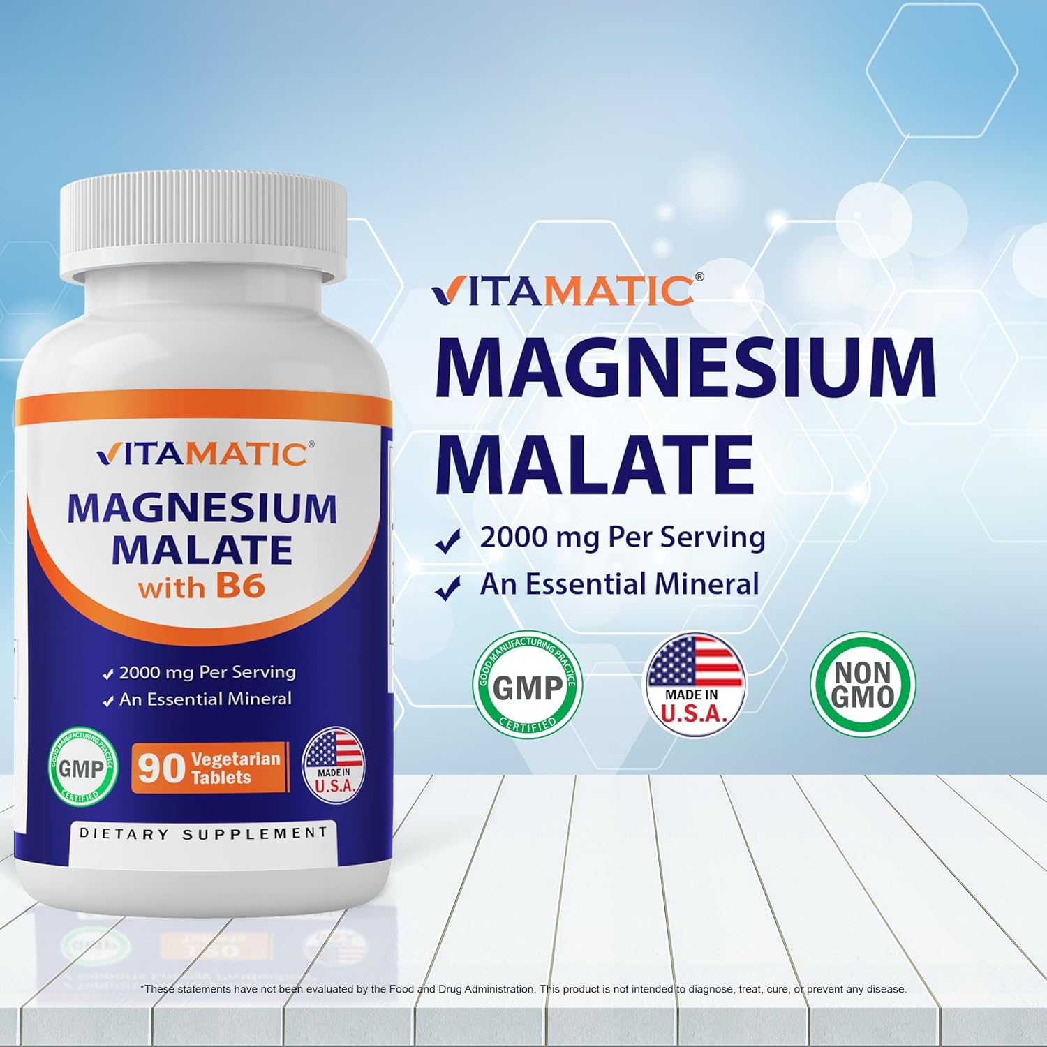 Vitamatic Magnesium Malate 2000mg per serving - 90 Vegetarian Tablets - Added B6 for Maximum Absorption - Supports Muscle, Joint, and Heart Health*