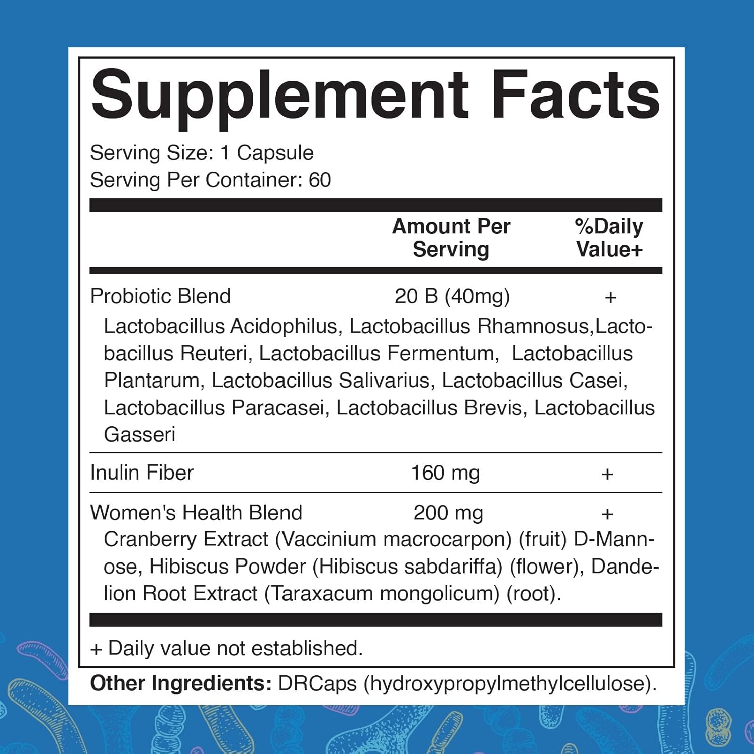 Lactobacillus Acidophilus, Lactobacillus Rhamnosus, Lactobacillus Reuteri, Lactobacillus Fermentum, Lactobacillus Plantarum, Lactobacillus Salivarius, Lactobacillus Casei, Lactobacillus Paracasei, Lactobacillus Brevis, Lactobacillus Gasseri, Inulin, Cranberry, D-Mannose, Hibiscus, & Dandelion Root